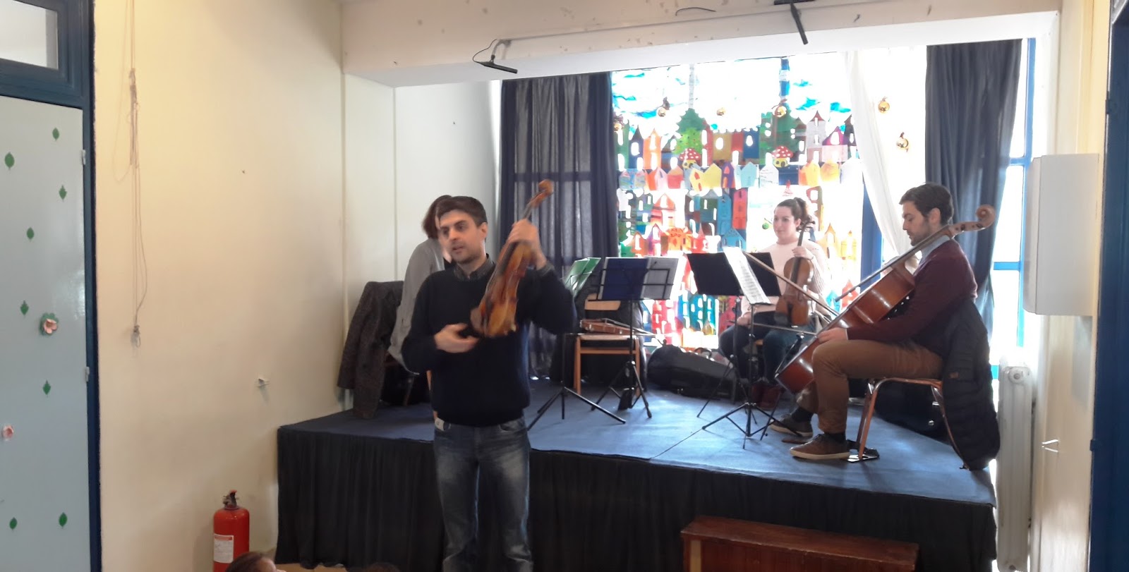 Το Κουαρτέτο Εγχόρδων της Αθηναϊκής Συμφωνικής Ορχήστρας Νέων - ΑΣΟΝ μας παρουσίασε με διαδραστικό τρόπο τα όργανα της ορχήστρας τους, άλλοτε με μορφή παραμυθιού και άλλοτε παίζοντας παιχνίδια με τους μαθητές, έτσι ώστε να έρθουν σε επαφή και να "γευτούν" τι σημαίνει κλασσική και ποιοτική μουσική.